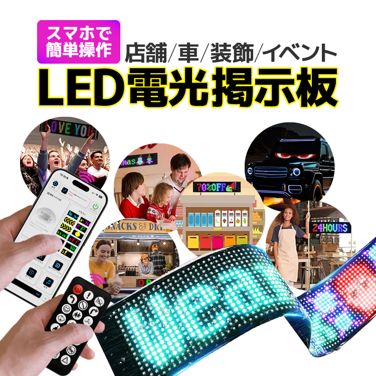 スマホとBluetoothで接続して、アプリで簡単に操作できる日本語に対応したLED電光掲示板です。