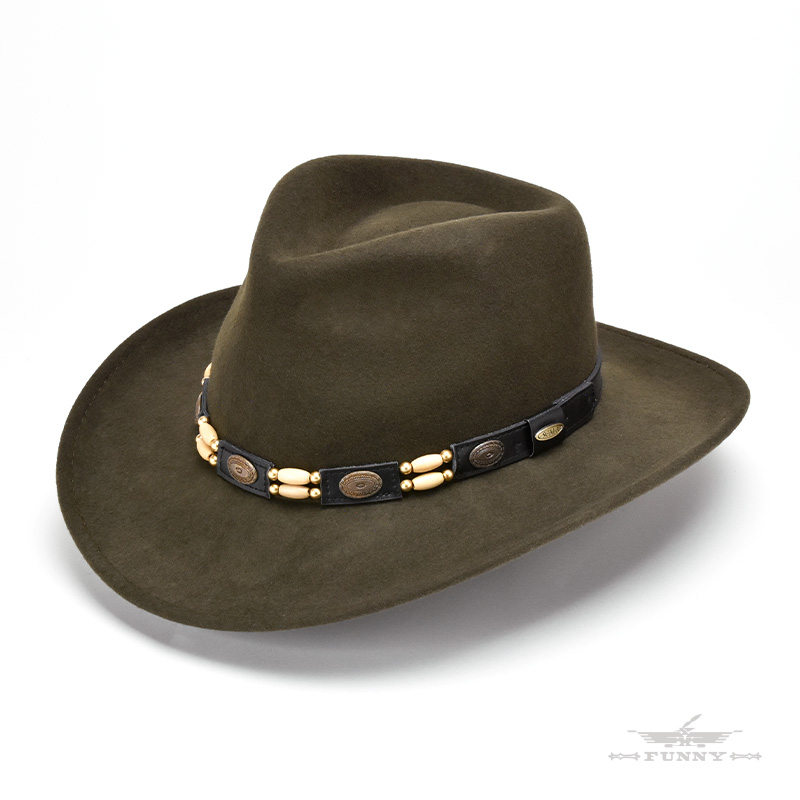 本製品はレザーのハットバンドにコンチョとビーズの装飾が施されたウール100%のクラッシャブルハットです。