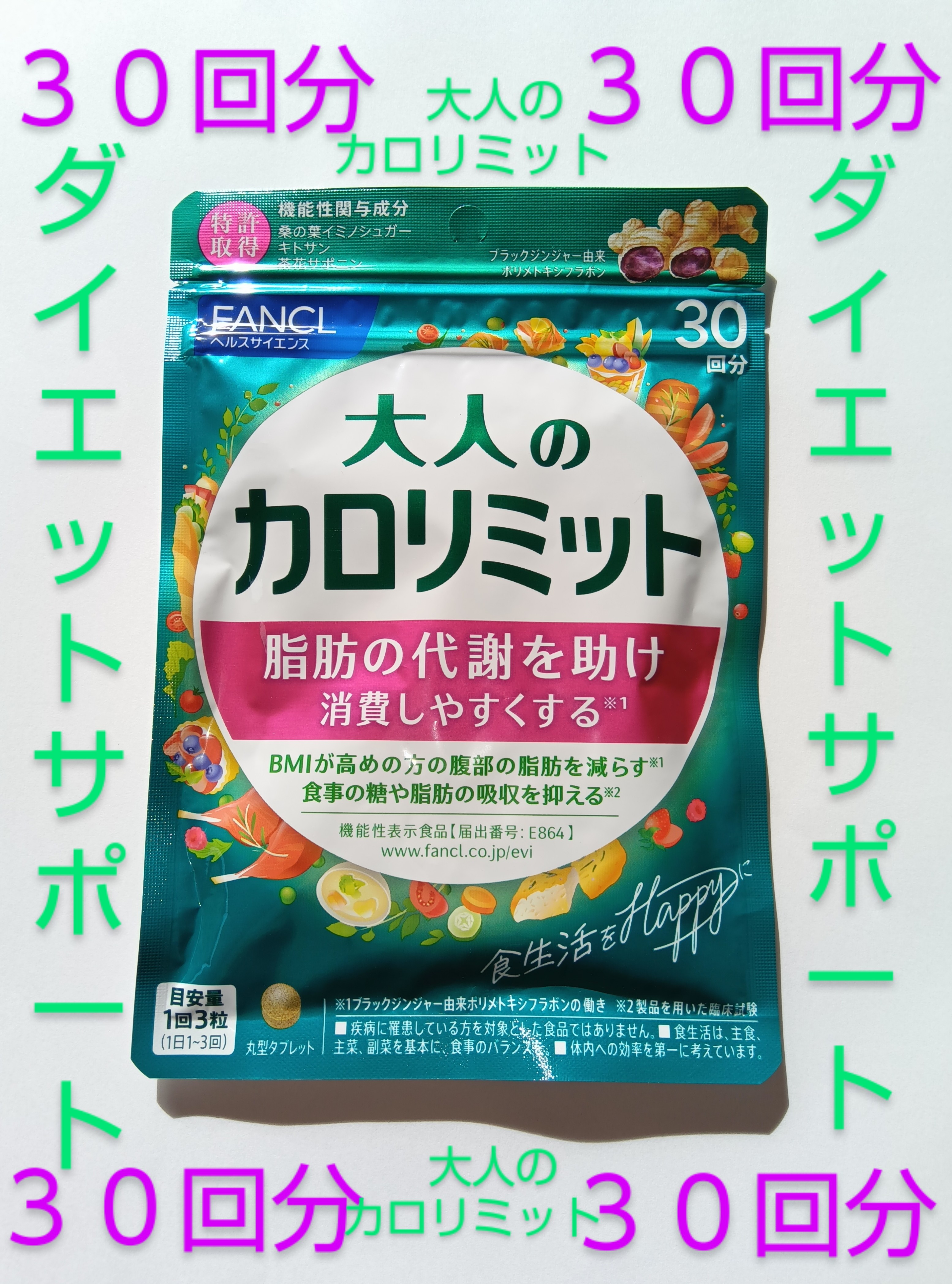 旧商品の場合あり大人のカロリミット30回分リニューアル新登場ピンクデザインダイエットサポート栄養補給♪【1日の目安】旧商品の場合あります♪1回3粒、1日1〜3回♪♪♪♪♪♪♪【機能性関与成分/1回3粒当たり】桑の葉イミノシュガー:1.75mg、キトサン:100mg、茶花サポニン:0.85mg、ブラックジンジャー由来ポリメトキシフラボン:12mg【機能性表示食品についてのご注意】※疾病の診断、治療、予防を目的としたものではありません。※特定用保険用食品とは異なり、消費者庁長官による個別審査を受けたものではありません。※食生活は、主食、主菜、副菜を基本に、食事のバランスを。【特許取得】「特許第6633173号」桑の葉エキス、キトサン、茶花エキスの3成分の組み合わせは特許を取得しています。「特許第5969680号」キトサンを溶けやすくする特許を取得しています。●「大人のカロリミット」は(株)ファンケルの登録商標です。【アレルギー物質】かに【ご注意】※妊娠・授乳中の方、お子様はお召し上がりにならないでください。【効果的な摂り方】お食事の時に1回3粒を目安に、1日3回までお召し上がりください。2〜3回分を一度にお召し上がりにならないでください。特に、糖や脂肪が気になる食事の前に、まとめて3粒をお摂りください。※効果には個人差があります。【原材料】桑の葉エキス末(桑の葉エキス)、桑の葉エキス末(でんぷん分解物)、キトサン、ブラックジンジャーエキス末(ブラックジンジャーエキス)、ブラックジンジャーエキス末(でんぷん分解物)、茶花エキス末(茶花エキス)、茶花エキス末(でんぷん分解物)、でんぷん、食用ホタテ貝殻粉、セルロース、環状オリゴ糖、微粒二酸化ケイ素、ヒドロキシプロピルセルロース、ステアリン酸カルシウム、シェラック