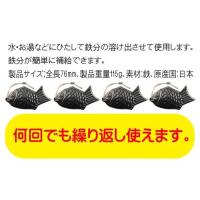 お湯を沸かす際、やかんに入れて鉄分補給にお使いいただければ貧血対策になります。手間なく低コストで鉄分補給できます。お茶、鍋物、味噌汁、ご飯を作る際などにもお使いいただけます。 貝類の砂出しに入れると、より早くきれいに砂をはきます。黒豆を煮る時に入れると、色が一段とさえます。 茄子と一緒に入れて漬け込むだけで美しい紫色の茄子漬になります。 1個サイズ:約44×76mm 重量:115g 素材:鉄 原産国:日本