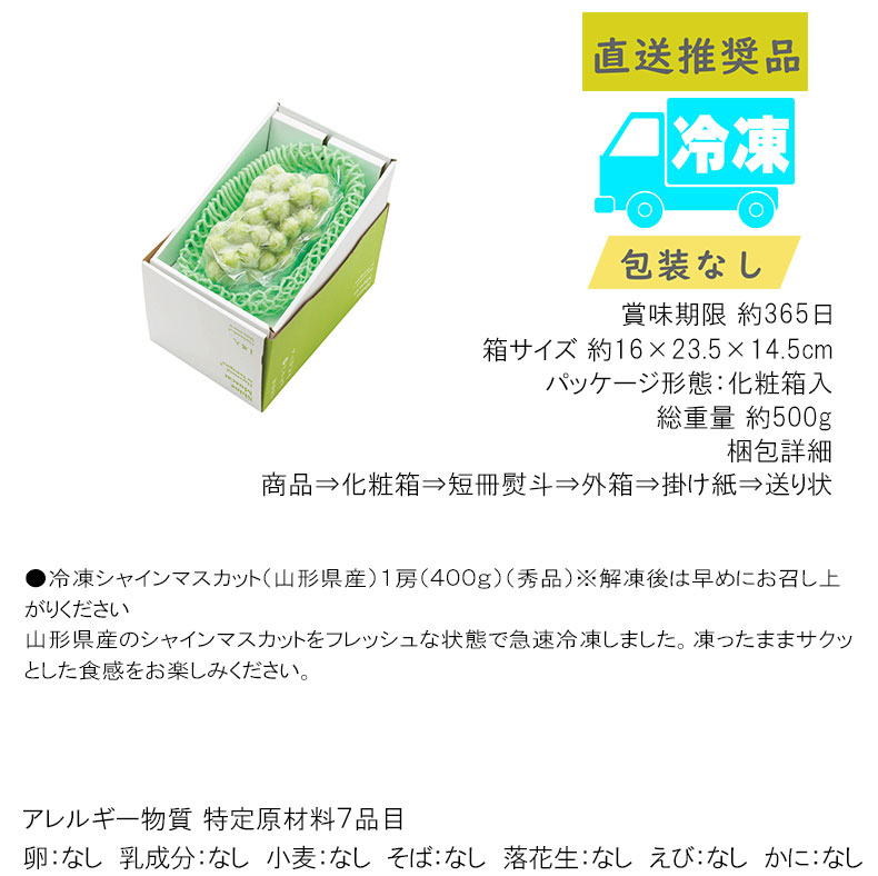●冷凍シャインマスカット(山形県産)1房(400g)(秀品)※解凍後は早めにお召し上がりください山形県産のシャインマスカットをフレッシュな状態で急速冷凍しました。凍ったままサクッとした食感をお楽しみください。箱サイズ 約16×23.5×14.5cmパッケージ形態:化粧箱入総重量 約500g賞味期限 約365日アレルギー物質 特定原材料7品目卵:なし 乳成分:なし 小麦:なし そば:なし 落花生:なし えび:なし かに:なし