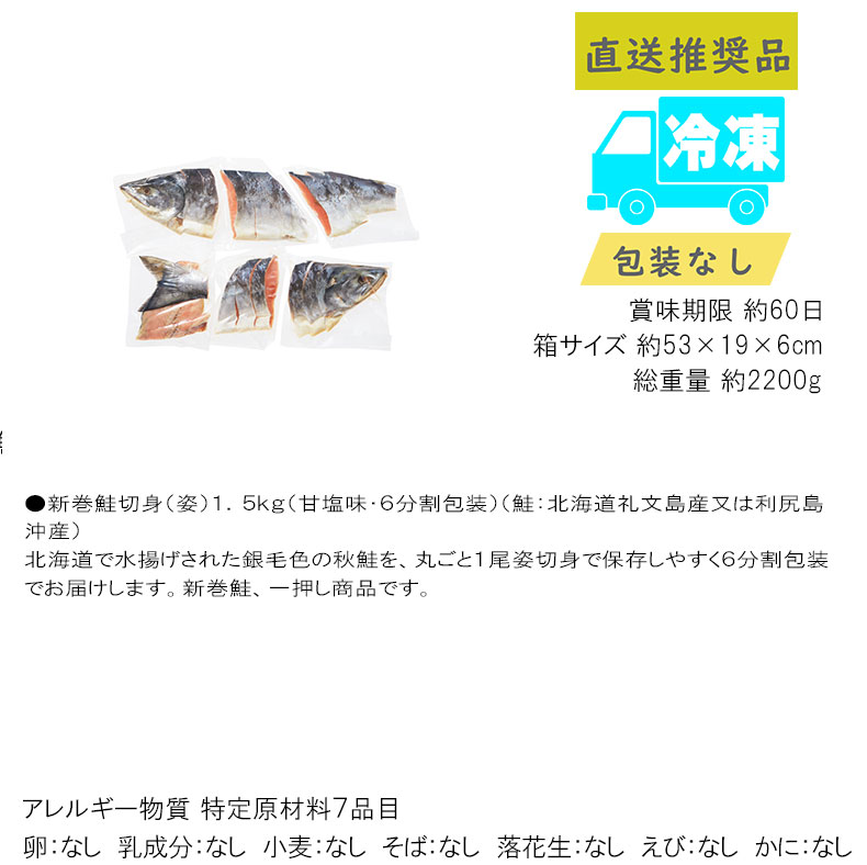 ●新巻鮭切身(姿)1.5kg(甘塩味・6分割包装)(鮭:北海道礼文島産又は利尻島沖産)北海道で水揚げされた銀毛色の秋鮭を、丸ごと1尾姿切身で保存しやすく6分割包装でお届けします。新巻鮭、一押し商品です。箱サイズ 約53×19×6cm総重量 約2200g賞味期限 約60日アレルギー物質 特定原材料7品目卵:なし 乳成分:なし 小麦:なし そば:なし 落花生:なし えび:なし かに:なし| 関連商品 | ||