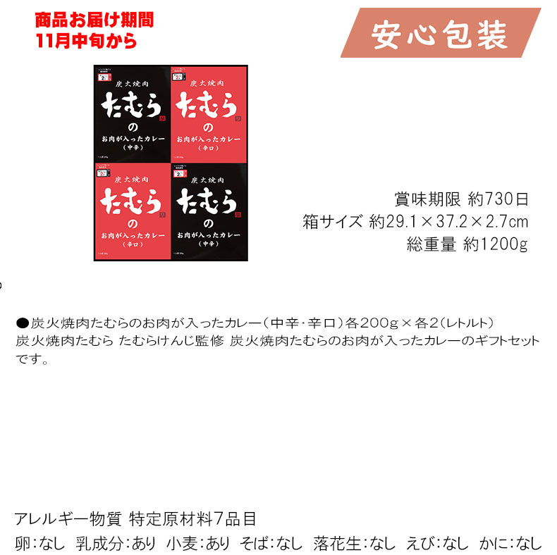 ●炭火焼肉たむらのお肉が入ったカレー(中辛・辛口)各200g×各2(レトルト)炭火焼肉たむら たむらけんじ監修 炭火焼肉たむらのお肉が入ったカレーのギフトセットです。箱サイズ 約29.1×37.2×2.7cm総重量 約1200g賞味期限 約730日アレルギー物質 特定原材料7品目卵:なし 乳成分:あり 小麦:あり そば:なし 落花生:なし えび:なし かに:なし| 関連商品 | ||