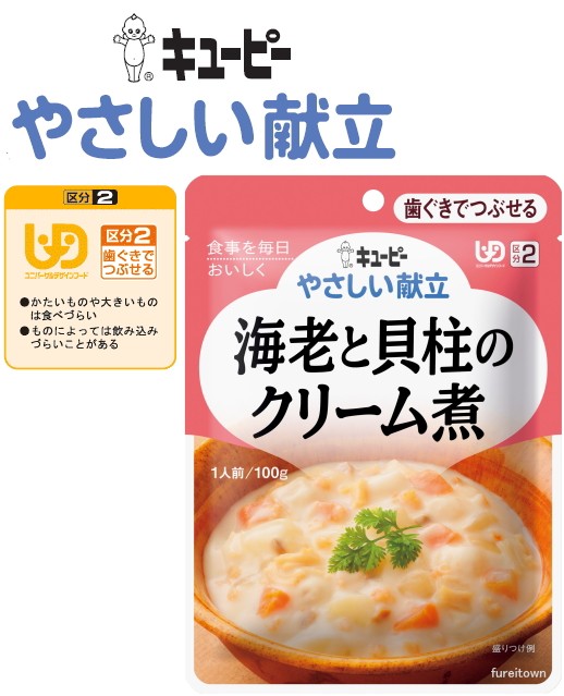 介護食 キューピー やさしい献立 海老と貝柱クリーム煮 えびと貝柱、玉ねぎ、じゃがいも、にんじん クリームのソースおかず 区分2 歯ぐきでつぶせる