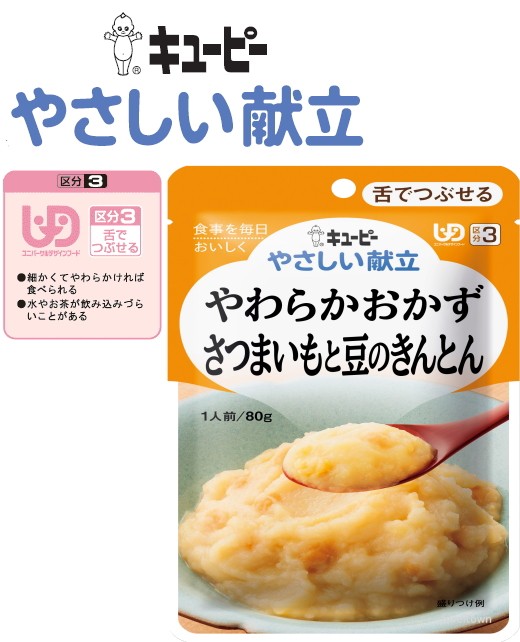 介護食 キユーピー やわらかおかず さつまいもと豆のきんとん 80gさつまいもと、豆のきんとん 練りごまの風味で甘めに仕上げました。区分3 舌でつぶせる