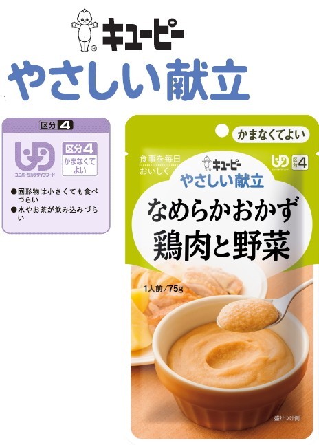 キユーピー やさしい献立 は、毎日楽しく食べていただけるように、 ● 塩分を控えながらもだしを使ってしっかりとした味つけにしています。 ● 不足しがちな栄養素に配慮して、エネルギー・たんぱく質・カルシウム・食物繊維を強化しています。 ● 4つの区分それぞれに、主菜から副菜、補助食にいたるまでの品揃えをしています。 商品名 キューピー やさしい献立 なめらかおかず 鶏肉と野菜 規 格レトルト食品(UDF区分4:かまなくてよい) 内容量 75g 販売元 キューピー株式会社 生産国 日本 賞味期限 製造後2年1ヶ月 アレルギー表示 卵・大豆・鶏肉 主な原材料 鶏肉(国産)、ソテーオニオン、野菜(じゃがいも、セロリ)、植物油脂、大豆、チキンエキスパウダー、食塩、香辛料/増粘剤(加工でん粉、キサンタンガム)、調味料(アミノ酸等)、卵殻カルシウム、(一部に卵・大豆・鶏肉を含む) 保存方法 直射日光を避け、常温で保存してください。 ●乳幼児向け商品ではありません。 ●この商品はレトルトパウチ食品です。 ●黒い粒は原材料の一部です。 調理方法 レトルト食品はすべて調理済ですので、温めなくても召しあがれます。 ・お湯で温める場合 ・・・約1分 袋の封を切らずにお湯に入れてください。 ※沸騰させたまま温めないでください。 ・電子レンジで温める場合 ・・・500Wで約20秒 必ず中身を深めの容器に移し、ラップをかけて温めてください。 ※電子レンジの機種により、加熱時間を加減してください。 |