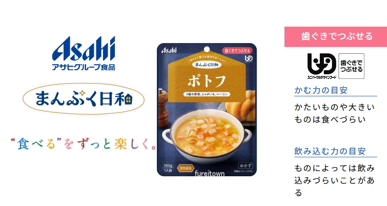 アサヒグループ食品の介護食「まんぷく日和」は、 介護を必要とされる方の「食の楽しみ」をいちばんに、 メニュー開発を追求しました。