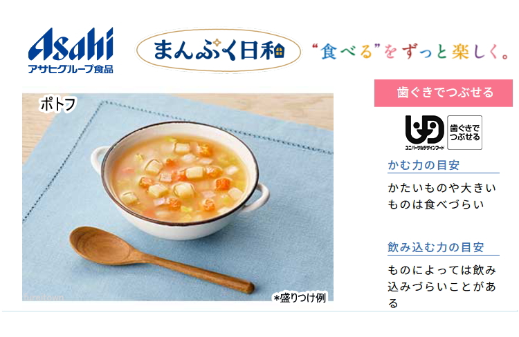| ・介護が必要な方の「食べたい」気持ちに寄り添い、「おいしくて、食べやすい」にこだわりました。まんぷく日和で、ご家族の楽しい食事時間を。 ・彩りよく様々な食材のおいしさ。 プチ贅沢な商品を食べたいと思う高齢者のために。 ・見た目や食感で満足感、具材を楽しむやわらか食おかず。 やわらかく煮込んだじゃがいも、にんじん、たまねぎ、はくさいに、ベーコンの風味が香るほっこり温まるポトフです。食物繊維入り。 賞味期限/製造後1年6ヶ月 |