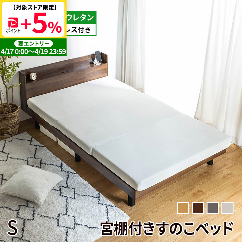 シングル マットレスセット すのこ 棚付き コンセント シンプル 高反発 マットレス 三つ折り 3つ折り 厚さ10cm ウレタン
