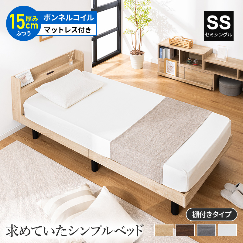すのこベッド マットレスセット ボンネルコイル 2口コンセント付き すのこ セミシングル マットレス ベッドフレーム 棚付き シンプル 北欧風