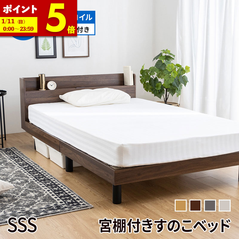 すのこベッド マットレスセット ボンネルコイル 2口コンセント付き すのこ セミシングルショート マットレス ベッドフレーム 棚付き シンプル 北欧風