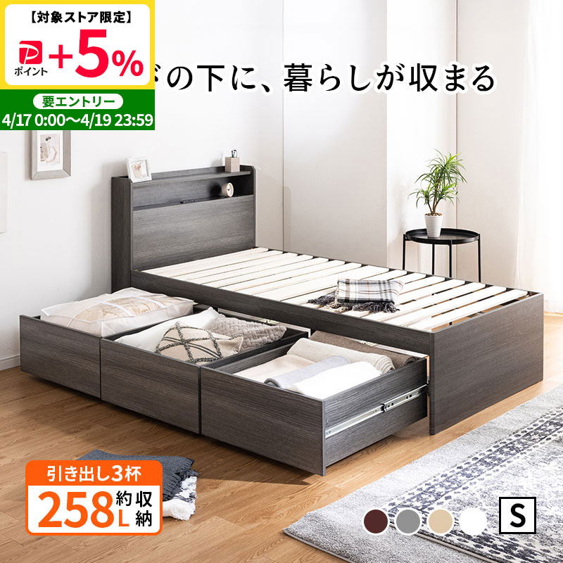 新商品 収納ベッド 大容量 奥行68cm 引き出し3杯 フルスライドレール すのこ コンセント付き 棚付き 頑丈 耐荷重200kg モダン シンプル 収納付きベッド シングル