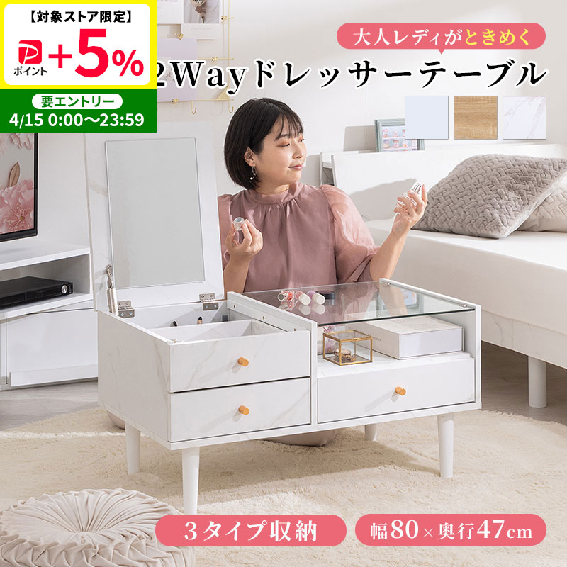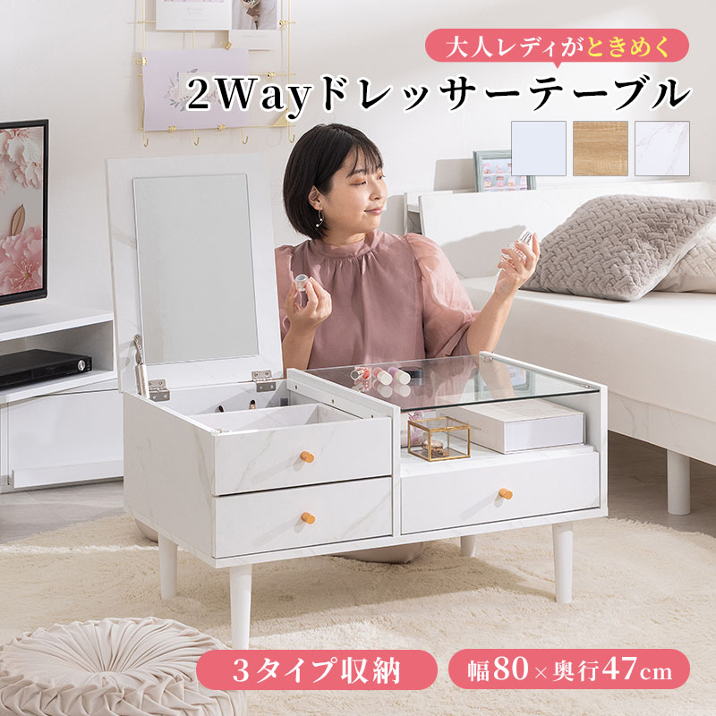 ドレッサー ドレッサーテーブル 一面ドレッサー 2way ローテーブル テーブル メイク 化粧 コンパクト 幅80cm 大理石調 インテリア 見せる収納