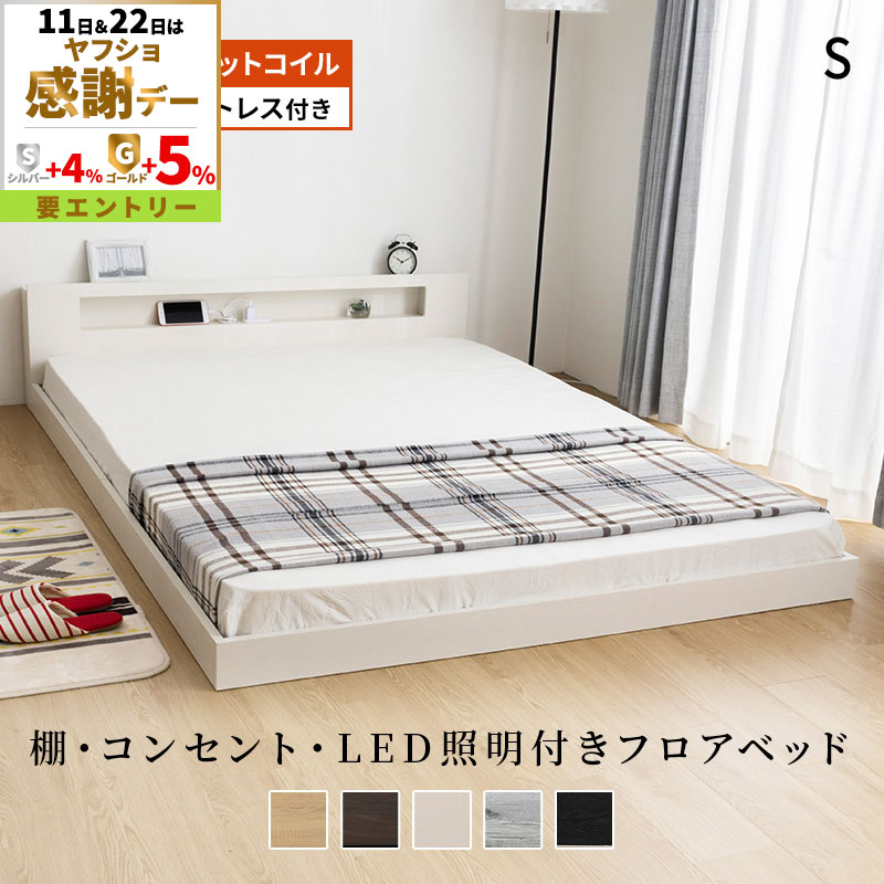 フロアベッド シングル マットレスセット ポケットコイルマットレス 硬め コンセント付き LED照明 ロータイプ ローベッド 宮棚 コンパクト