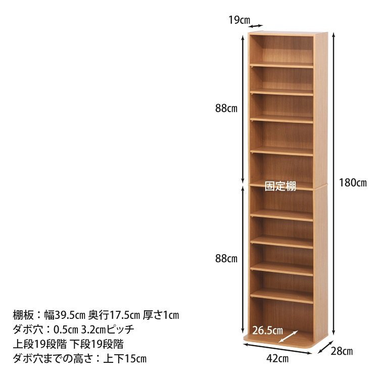 | 商品サイズ(mm) | 全体:幅420 × 奥行190〜280 × 高さ1800 耐荷重(全体):30kg 耐荷重(棚板):10kg 板厚:10mm |