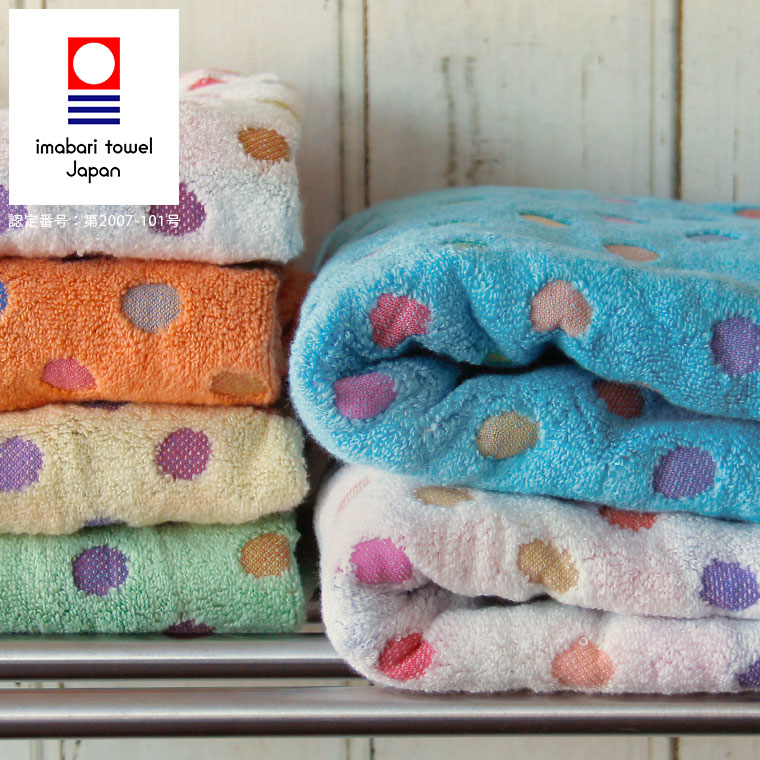 とにかくふわっふわ!とにかくやわらか! タオルの域を超えた包まれたくなるやさしい風合いにポップなドット柄のタオルは、やさしさいっぱい、元気100倍、そんなタオルシリーズ。 十分すぎる厚みに無撚糸のふわふわやさらかな肌触りで、タオルとしての吸水性・拭き心地は抜群です。 また、カラフルなドット柄は25色もの色数で、タオルいちめんに弾ける水玉模様もこのタオルシリーズの人気の一つ。 お風呂上がりは、このやさしい肌触りがたまらない。 しっかり厚みがある吸水性抜群のタオルは、キッチンや洗面所など1日に何度も使用するタオル場所でも大活躍! 使うたびに笑顔になる、使うみんなが笑顔になる… 笑顔が溢れる毎日を、今治タオル・ポップカラーと一緒に過ごしてみませんか?
