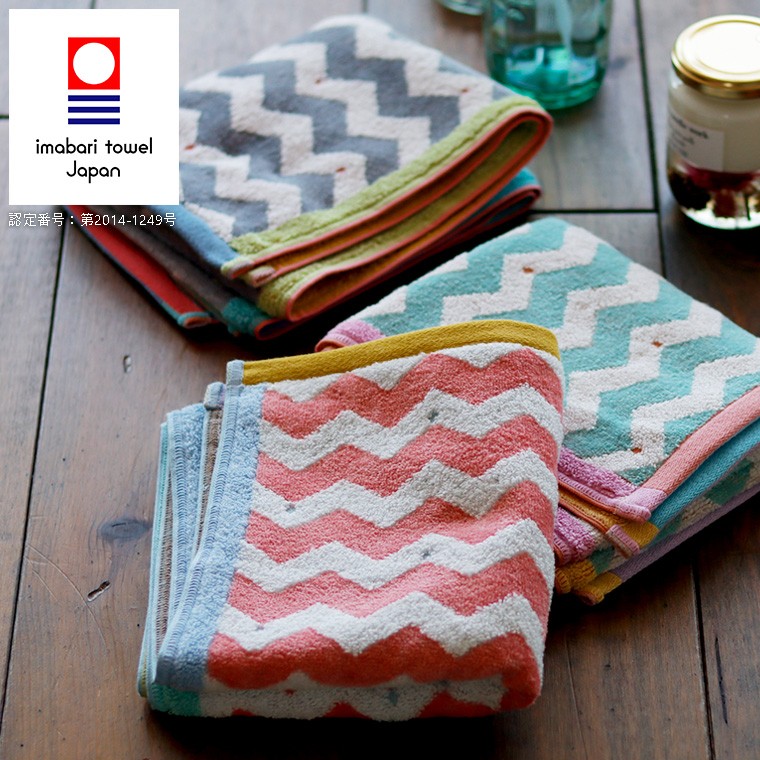 愛媛県今治市の今治タオルメーカー「七福タオル」の、ポップなギザギザストライプ柄のフェイスタオル。 愛媛県今治市で作られた、純国産の今治タオル。「七福タオル」の商品は、品質の良さだけでなく、元気をもらえる、思わず楽しくなってしまうデザインが魅力。