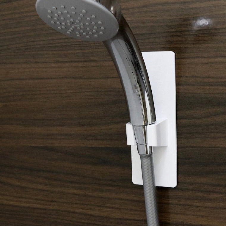 最近のバスルームはシャワーバーがついているので、上下自由にシャワー位置を変更できますが、このシャワーフックを使えば、左右にも調整ができるんです。