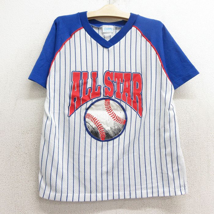 【商品名】 古着 半袖 ビンテージ シャツ キッズ ボーイズ 子供服 90年代 90s オールスター 野球 ベースボール ラグラン メッシュ地 Vネック USA製 白他 ストライプ