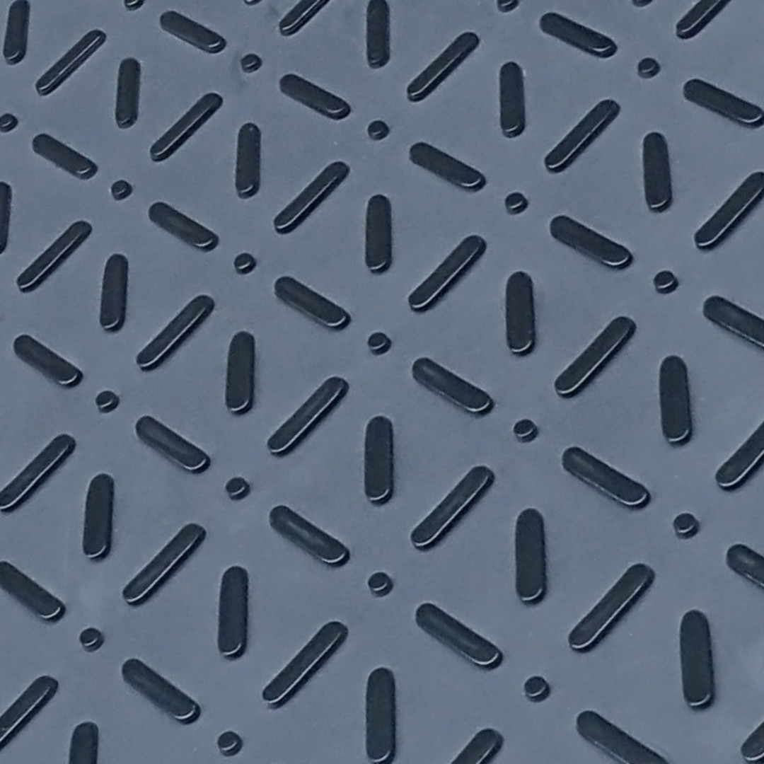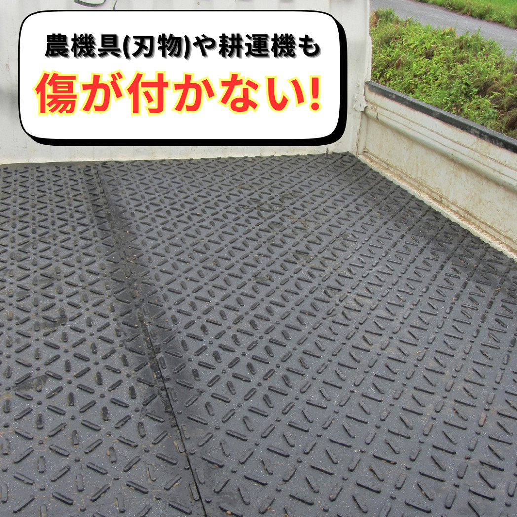 特許製法の滑り止め付きで、車両走行も雨天時の歩行も安心です。裏返すとフラットで台車やカートもスムーズに使用できます。4角には固定用の止め具用の穴が用意されています。また地面養生だけでなく、荷台養生では敷くだけでフラットな床面が実現。