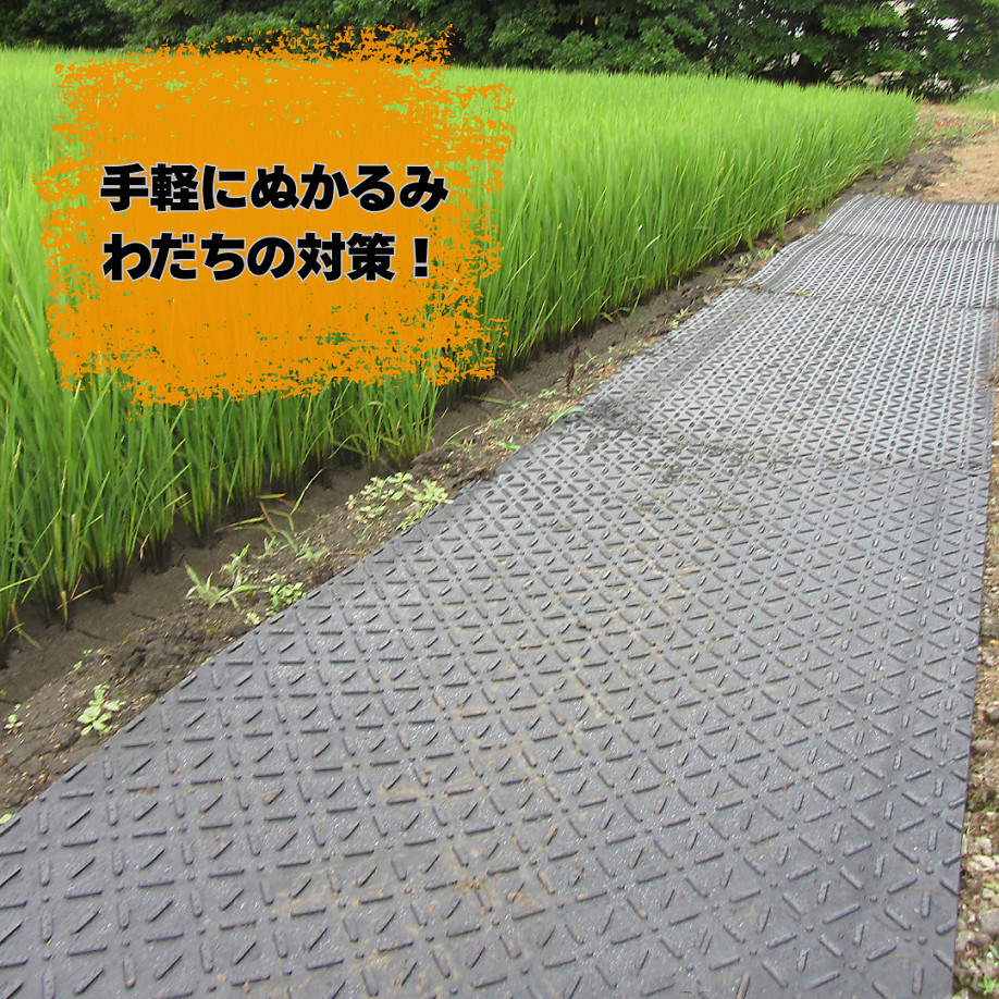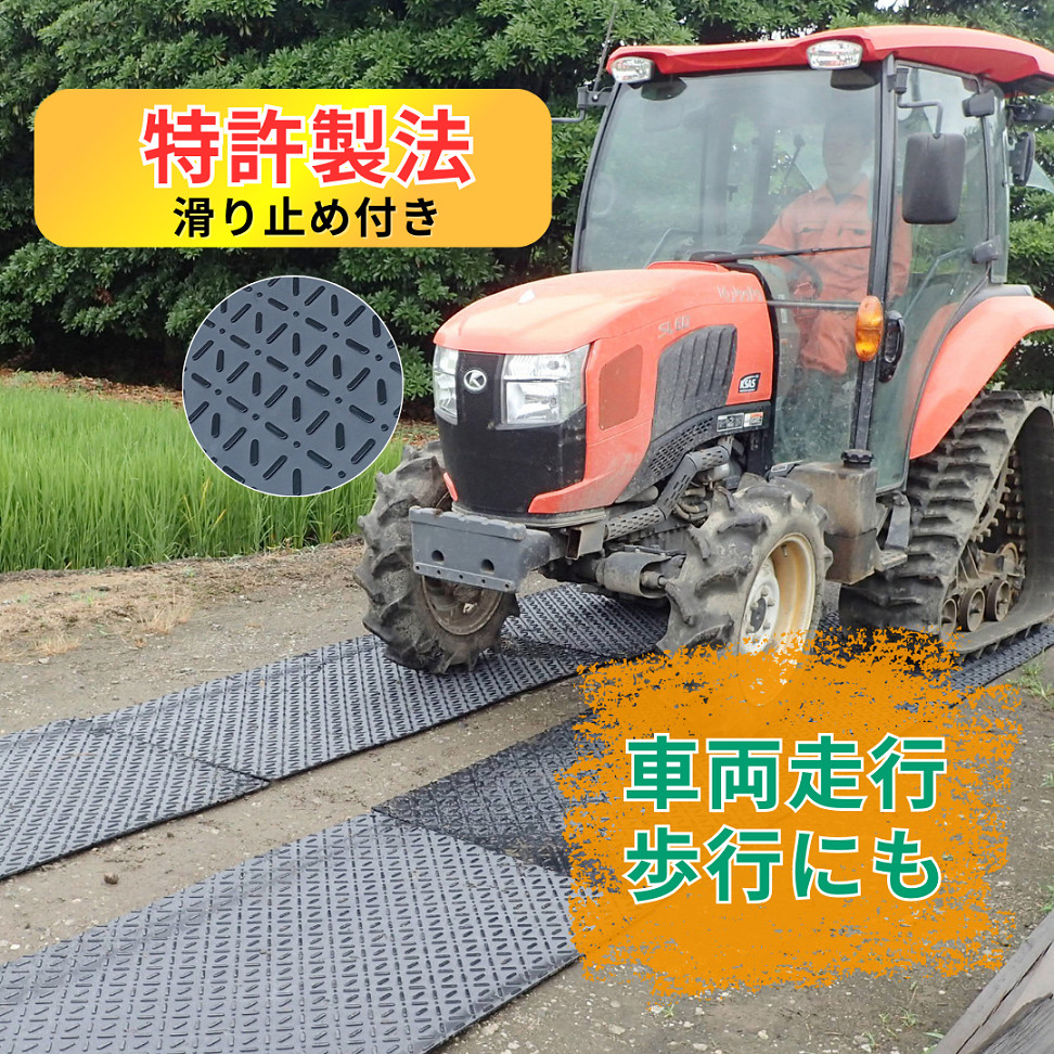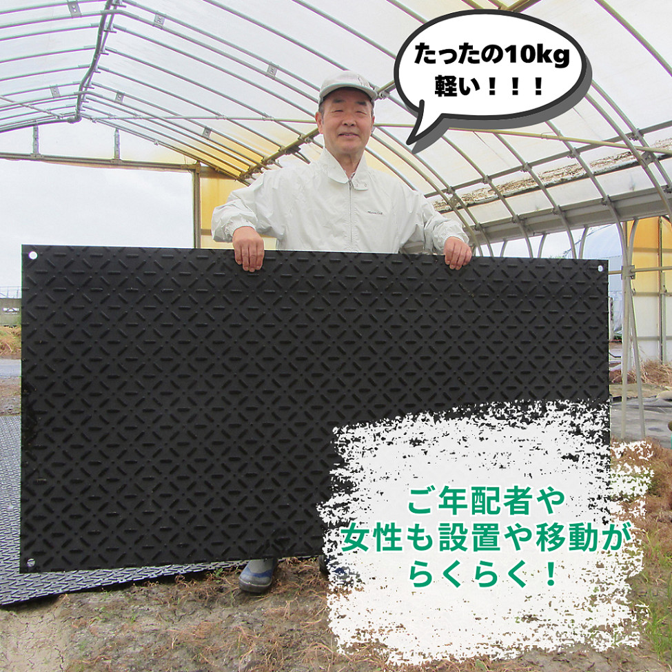 ご年配者や女性も設置・移動がらくらくできる1枚10kg(910×1,820mm)。軽トラやトラクター、耕運機等の走行や保管にも。