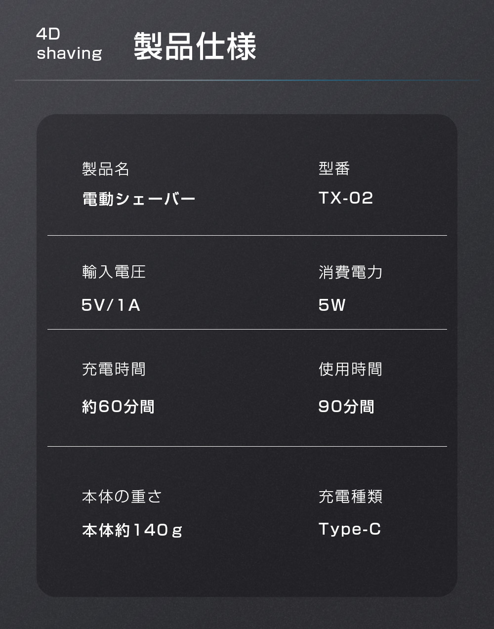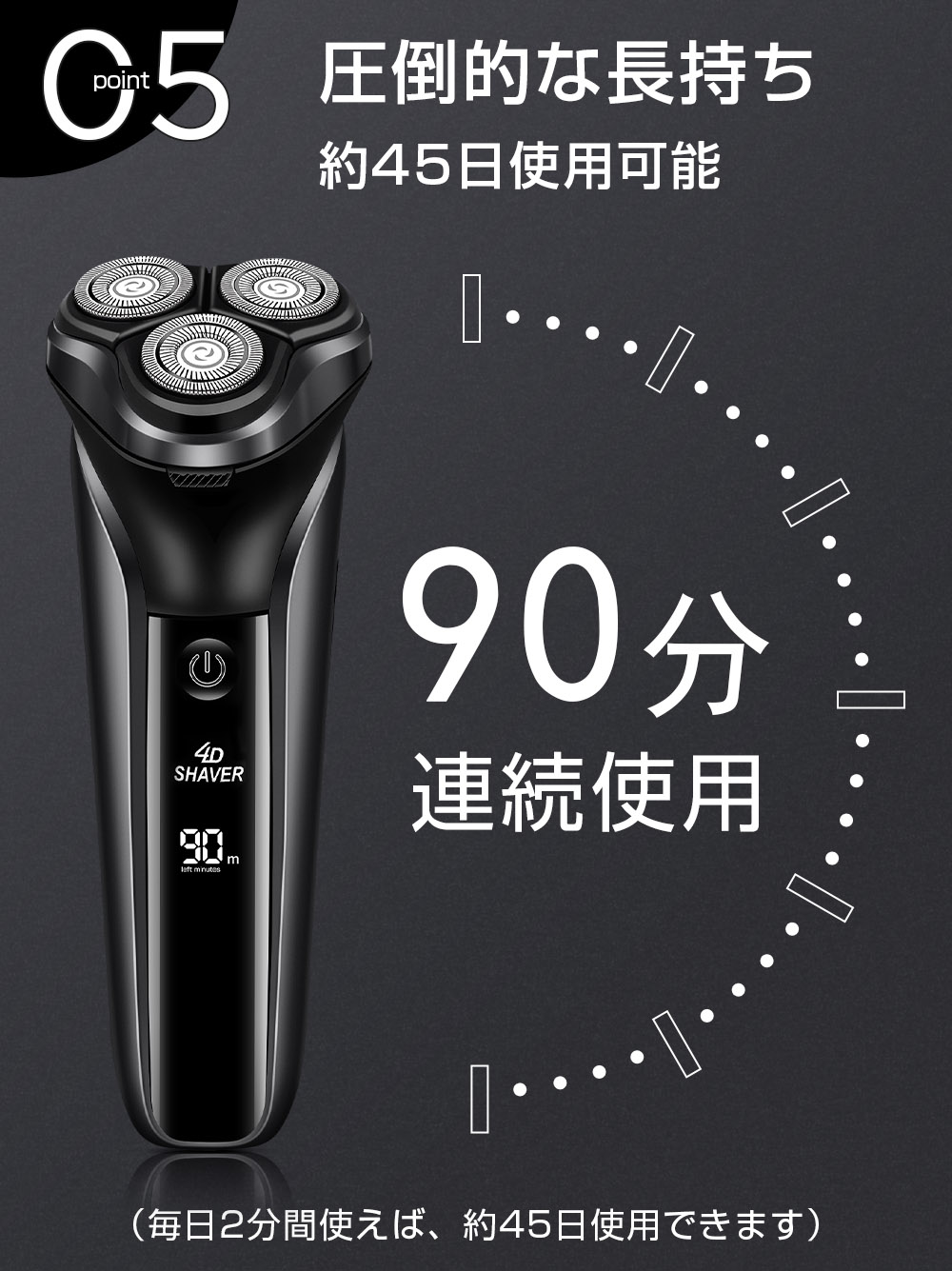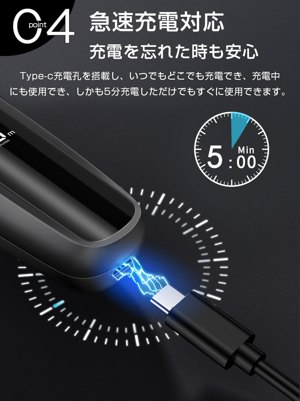 【大容量バッテリー・充電1回で90分使用可能】Type-C急速充電対応、高性能リチウムイオンバッテリーを搭載しており、フル充電で約45日使用可能(毎日2分間使えば、約45日間使用できます)。