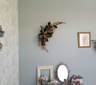 ドライのユーカリや落ち着いたモーブピンク系の素材を合わせた秋色スワッグです。