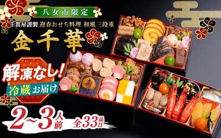 ふるさと納税 【八女市限定】千賀屋謹製 2026年 迎春おせち料理「金千華」 おせち 三段重 厳選食材使用 冷蔵 解凍不要 冷蔵お届け 冷蔵配送 家族.. 福岡県八女市