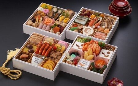 (四の重)クランベリーくるみ/うめ酒玉/金柑蜜煮/ふぐ皮明太子/〆鯖小川昆布巻/ずわい蟹爪/鶏三色巻/海老錦てまり/がめ煮/山くらげ浸し/ぼら粕漬/かぶら甘酢漬/かに風味蒲鉾土佐酢漬/もち玉串