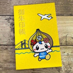 黄色の唐草模様の高価な地紋織りの生地に、田尻町のマスコットキャラクターたじりっちを表紙に刺繍した豪華で可愛い大判サイズの御朱印帳です。