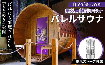 屋外用の樽型のサウナです。ロウリュ可能な電気ストーブが付属します。本体以外に輸送費・設置工事費が発生します。