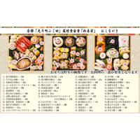 オニオンマリネ/紫白しぼり/渋皮栗甘露煮/百合根金団/鮭松前/ほうじ茶と小豆のクリームチーズわらび餅添え/たたき牛蒡/海老雲丹クリーム焼き/六角黄金焼き/穴子西京焼き/真鯛俵焼き/万願寺唐辛子甘唐漬/菜の花東寺巻き/たこ柔らか煮/鰤大根報奉書煮/田作り/小海老蜜煮/合鴨スモーク/金柑蜜煮/紅白梅かんざし/梅麩