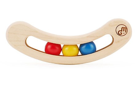 房の中に豆が3粒入ったデザインのラトル(ガラガラ)です。