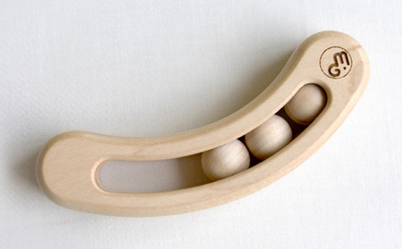 房の中に豆が3粒入ったデザインのラトル(ガラガラ)です。