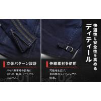 バイク乗車時の姿勢を考慮した立体的なパターンに伸縮性のある素材をかけ合わせる事により、腕の上げ下げもスムーズ。