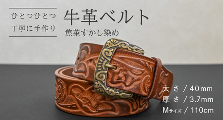 このベルトは、手作業で丸1日かけて柄を彫り、焦茶のすかし染めにて仕上げたものです。