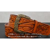 このベルトは、手作業で丸1日かけて柄を彫り、アンティーク調にタン染めにて仕上げたものです。