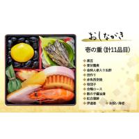 黒豆/栗甘露煮/金時人参入り生酢/田作り/赤魚西京焼/笹団子/合鴨ロース/数の子醤油漬/紅白蒲鉾/伊達巻/お祝い海老