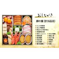 たこの甘酢漬/あんず梅酢漬/伊達巻/帆立ひもの柚子和え/寿高野含め煮/味付こんにゃく/筍煮〆/椎茸旨煮/梅甘露煮/花百合根/紅白蒲鉾/蟹爪柚庵焼/あわび姿煮/梅型人参/手まり麩/松麩