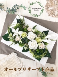 豪華で上品なアレンジです。インテリア、ギフト、母の日のプレゼントにもおすすめです。 シュガーパインの製品は造花を一切使用せず、高品質のプリザーブドフラワーとドライフラワーのみを使用しています。高級花(プリザーブドフラワーではあまり使用される事が少ないお花)など、取り扱いが困難な花材も多数使用し、厳しいクオリティーチェックに合格した製品のみ出荷しております。 ご自宅のインテリアや大切な方へのプレゼントに、皆様の暮らしの一部にやすらぎを与える事ができたら幸いです。