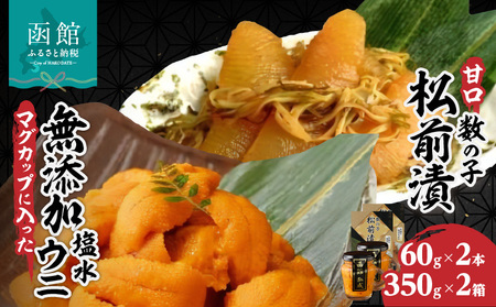 マグカップ入り無添加塩水ウニ60g×2本(北海道産またはロシア産※時期によって変わります)函館名産 数の子松前漬350g×2箱