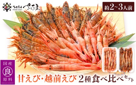 プリップリの甘えびと希少な越前えび2種を楽しめる食べきりサイズのセットです。解凍しやすいように各種別々に冷凍いたしました。