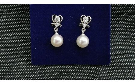 ラウンド・セミラウンド系の6.5mmのあこや本真珠が揺れるタイプのピアスです。フォーマル用には向かない真珠ですが、しっかりとした真珠です。デザイン部分の大きさは、約7.2mm×約6.5mmで、リボンをモチーフにしています。シルバー製ですが、変色防止のロジウム加工が施されています。