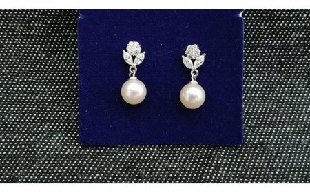 ラウンド・セミラウンド系の6.5mmのあこや本真珠が揺れるタイプのピアスです。フォーマル用には向かない真珠ですが、しっかりとした真珠です。デザイン部分の大きさは、約6.8mm×約6.5mmで、お花をモチーフにしています。お花には、キュービックジルコニアがあしらわれております。シルバー製ですが、変色防止のロジウム加工が施されています。