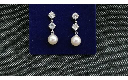 ラウンド・セミラウンド系の6.5mmのあこや本真珠が揺れるタイプのピアスです。フォーマル用には向かない真珠ですが、しっかりとした真珠です。デザイン部分の大きさは、約12.5mm×約5.3mmで、キュービックジルコニアが縦に2個並んでいます。シルバー製ですが、変色防止のロジウム加工が施されています。