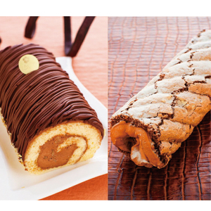 濃厚クリームをたっぷり巻いたロールケーキの上には、さらにチョコレート使用のショコラモンブランを敷き詰めました。