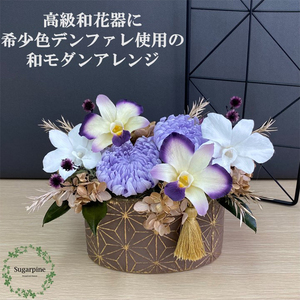 大輪菊、2種のデンファレが入った華やかなアレンジ。