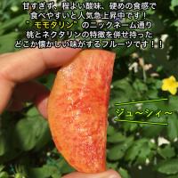 黄色く硬めの果肉、桃の甘さとネクタリンの酸味を良いとこどりした味わい。噛むと口いっぱいに果汁がひろがりますが、桃ほどではないため手を汚しにくいです。