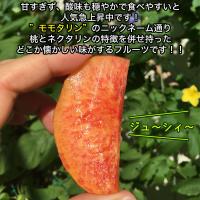 黄色く硬めの果肉、桃の甘さとネクタリンの酸味を良いとこどりした味わい。噛むと口いっぱいに果汁がひろがりますが、桃ほどではないため手を汚しにくいです。