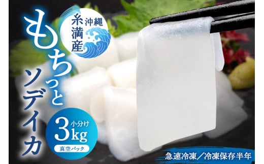 ソデイカの体長はなんと!約1mにもなり、重さが約20kgにもなる最大級の食用イカです。 獲れたてのソデイカは鮮やかな赤色で、味は繊細な味わいで食感はモチモチしており、噛んでいくうちに口の中で甘みがフワーと広がっていきます。さらに、バーナーで表面を炙ることにより、旨味がより一層引き出されます。 糸満市のソデイカは県全体の生産量の約20%を占めいて、鮮度を保つための取り組みなども評価されています。旬な時期は、11月〜6月頃で長く漁獲されています。 2015年にはソデイカ(方言名「セーイカ」)の拠点産地として県内で初めて認定を受けています。 ぜひ、「海人(うみんちゅ)のまち糸満」の海の幸をご賞味ください。